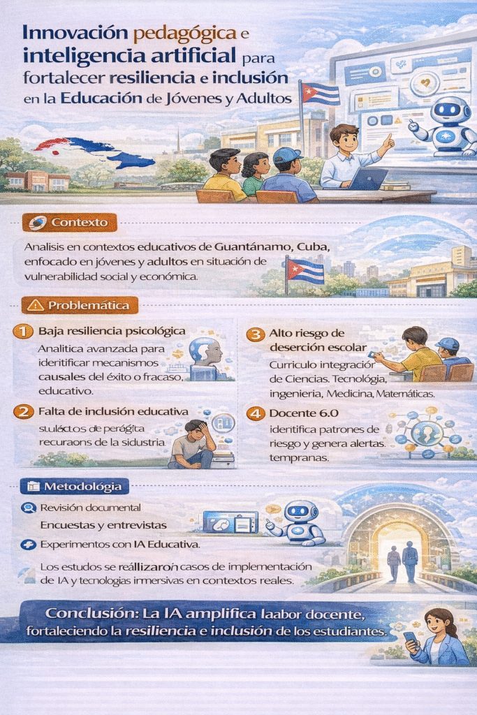 El objetivo general de la investigación es analizar cómo la innovación pedagógica y la inteligencia artificial pueden fortalecer la resiliencia y la inclusión educativa en jóvenes y adultos, contribuyendo a la permanencia escolar y al desarrollo integral de la población.