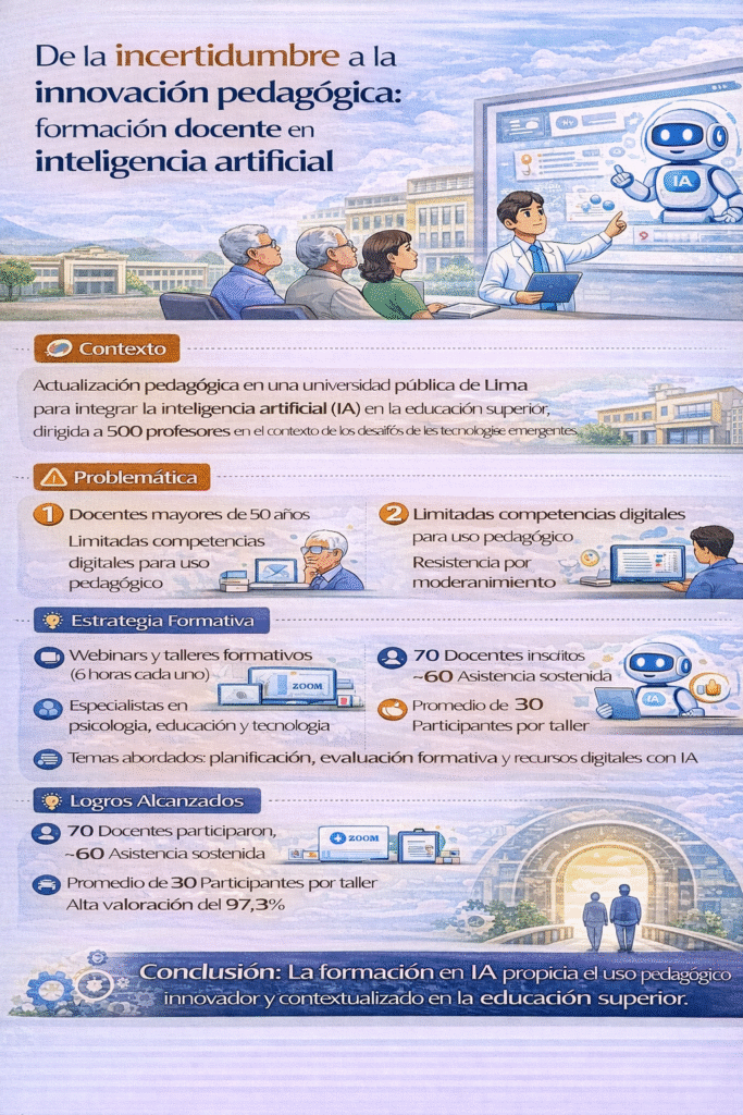 El presente trabajo se desarrolló en una universidad pública de Lima, en el marco de un proceso de actualización pedagógica orientado a la integración de la inteligencia artificial (IA) en la educación superior. La propuesta estuvo dirigida a docentes de pregrado y posgrado pertenecientes a diversas carreras de ingeniería, en una institución que cuenta con aproximadamente 500 profesores. Este contexto evidenció la necesidad de repensar las prácticas pedagógicas frente a los desafíos que plantean las tecnologías emergentes en el ámbito universitario.